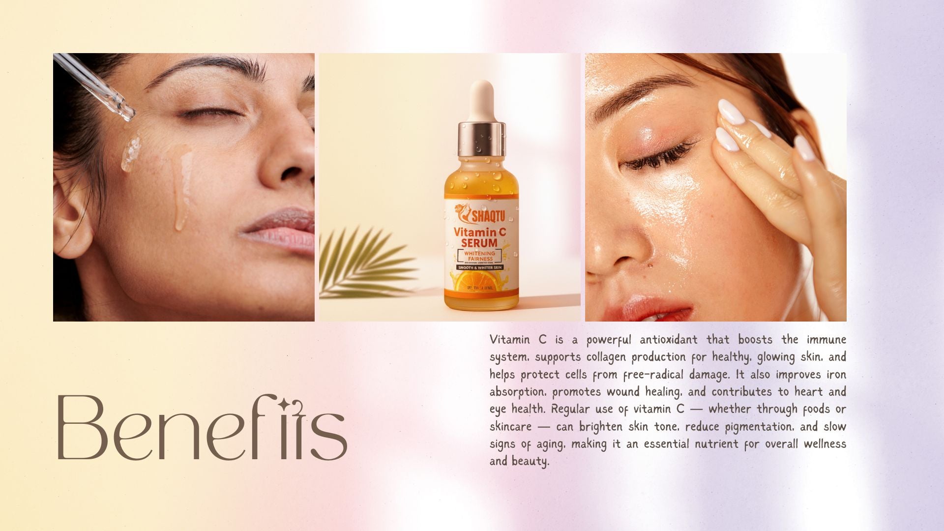 A vitamin C serum brightens skin tone, fades dark spots, boosts collagen for firmer texture, protects against sun-damage and free radicals, and helps soothe redness while improving overall radiance and vitality.